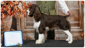 Aster is an active dog that does performance sports and therapy work as well as conformation. Aster's father, Buttercup (GCH CH Maxwell's Build Me Up Buttercup), finished his show career before 18 months with a grand champion title. Aster's mother, Lily Belle (Lily Belle Of Collverhaus CD BN RM2 RAE2 CGCA TKI FITB), came from a performance line of dogs who competed in agility and hunt tests. Lily Belle was invited and attended the Rally National Championship in 2022 and 2023. She also came from a kennel whose popularity was at its peak in the 1980s — Kay n Dee, whose dogs went to Westminster and also hunted birds when not in the show ring. Lily Belle came just short of her Rally Champion (RACH) before she retired after a couple litters of puppies, several of whom have gone on to compete in various performance sports.